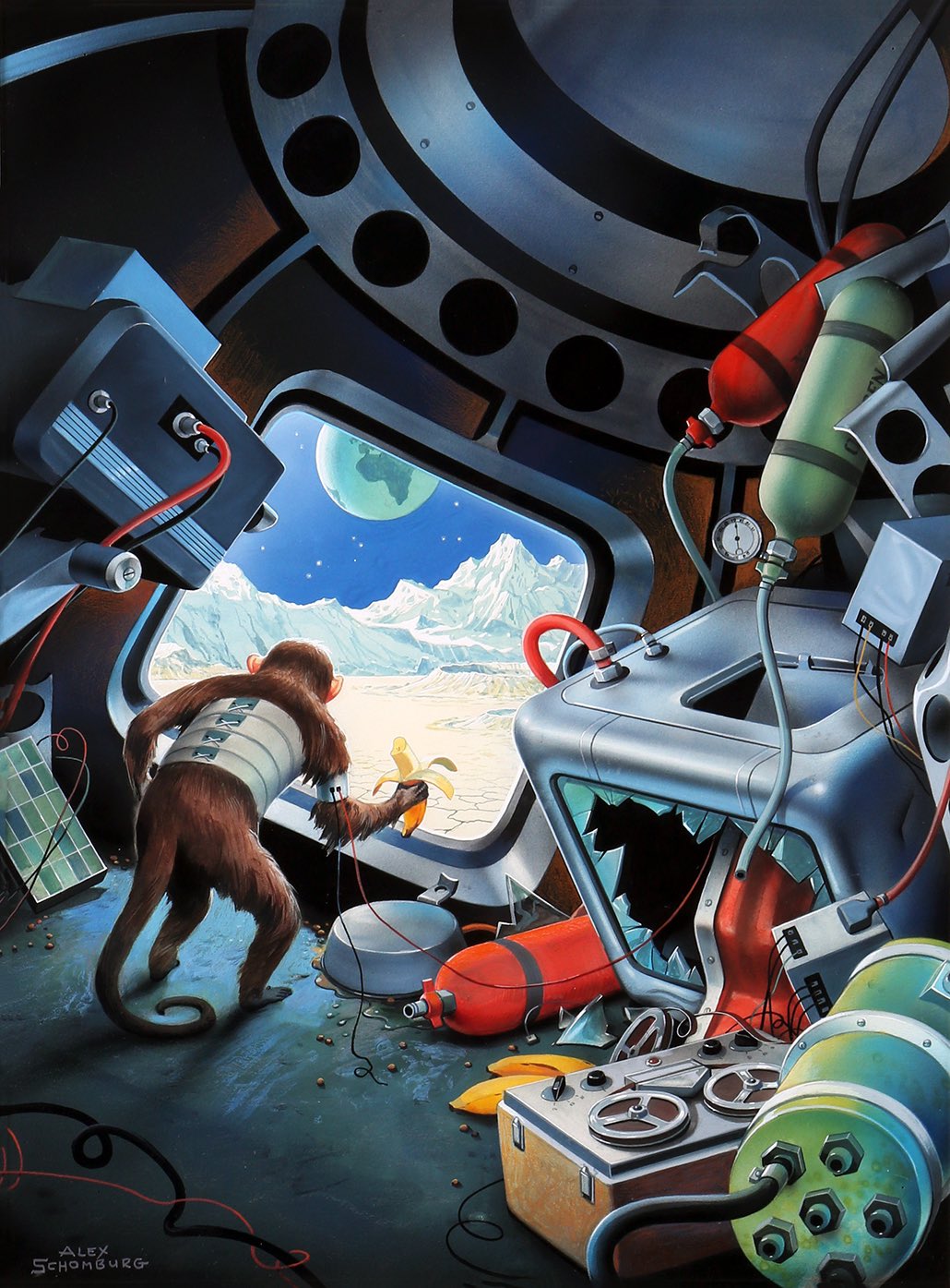 En los años treinta, Alex Schomburg, quien luego se convertiría en uno de los ilustradores y dibujantes más cotizados del mundo de los cómics, revistas y novelas de ciencia ficción, trabajaba en una compañía que se encargaba de preparar el material promocional de las películas de Hollywood, incluyendo los afiches y los avances que se proyectaban en los cines.