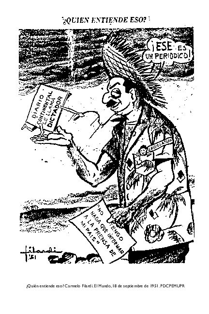 «Análisis sobre la desmitificación de colaboración que se le ha atribuido al periódico El Mundo, el principal rotativo puertorriqueño durante el siglo XX, con la obra del Partido Popular Democrático y su líder Luis Muñoz Marín. El gobierno insular, ya controlado desde 1948 por el propio Muñoz, impulsó un nuevo pacto político con la Metrópoli a fin de darle continuidad a las ventajas de la prosperidad económica. La fundación del Estado Libre Asociado de Puerto Rico en 1952 marcó el hito de esa nueva relación política con los Estados Unidos. El mundo iconográfico que se presentó en las décadas que comprenden 1940 hasta 1960, sobre todo en la década de los años cincuenta, se distinguió por dedicarse casi en exclusiva a resaltar el triunfo del progreso sobre el atraso. Sin embargo, otras complejidades quedaban diluidas en esa madeja disfrazada de dinamismo y vanguardismo. Las caricaturas de Filardi, aparecidas en El Mundo, a pesar de su aparente papel de colaboración con los signos del progreso, ya anunciaban las costuras mal hechas de ese modelo lleno de ribetes de modernidad pero contradictorio en sus interioridades. A través de las imágenes de Filardi, quien trabajó con dicho órgano periodístico por muchos años, veremos de forma jocosa algunas críticas severas a las ambigüedades y las limitaciones del populismo muñocista.» cita en el escrito de Medios y resistencia en la era muñocista: el periódico El Mundo y la caricatura de Filardi ante el proyecto histórico del Partido Popular Democrático de Rafael L . Cabrera Collazo