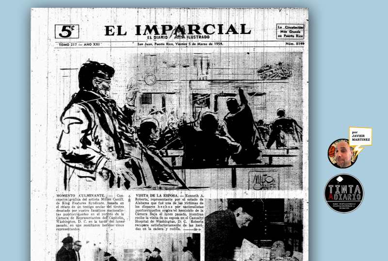 Pero ademas de publicar sus tirillas y noticias acerca de su vida. una nota de marzo 5 de 1954 me llama la atención y es que el periódico publicó una imagen realizada por Caniff en relación a los nacionalistas puertorriqueños que tirotearon el capitolio en 1954. El sindicato King Features Syndicate, que publicaba sus tiras, le debe haber asignado esa encomienda, incluyo la imagen que salió en portada y lo que indica la nota: